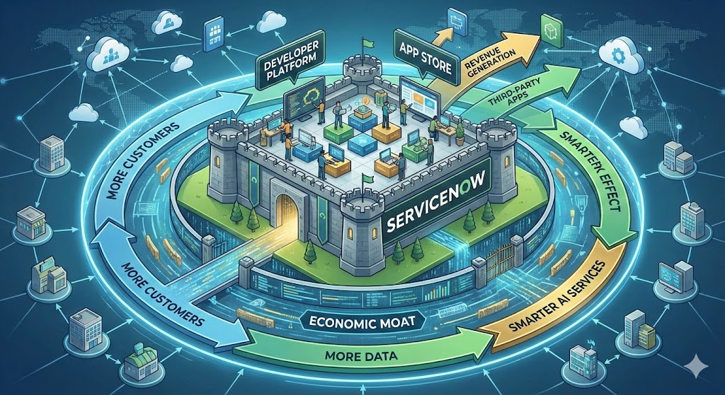 IT 전문가로서 제가 서비스나우의 비즈니스 모델을 높게 평가하는 또 다른 이유는 바로 무시무시할 정도로 강력한 '락인(Lock-in) 효과'입니다. 기업이 서비스나우를 도입한다는 것은 단순히 엑셀을 대체할 소프트웨어 하나를 설치하는 것이 아닙니다. 회사의 모든 업무 프로세스와 데이터를 서비스나우의 워크플로우 엔진에 태운다는 뜻입니다. 한번 이 시스템이 구축되어 직원들이 "무슨 일이 생기면 일단 서비스나우를 켠다"라는 습관이 잡히면, 다른 소프트웨어로 교체하는 것은 거의 불가능에 가깝습니다. 이 시스템을 걷어내려면 회사의 업무 프로세스 전체를 다시 설계해야 하기 때문에 전환 비용(Switching Cost)이 어마어마합니다. 이것이 바로 포춘 500대 기업(Fortune 500)의 85% 이상이 서비스나우를 사용하고, 구독 갱신율(Renewal Rate)이 항상 98~99%에 육박하는 이유입니다. 경기가 어려워져서 마케팅 비용은 줄여도, 회사의 신경망 역할을 하는 서비스나우를 끊을 수는 없으니까요. 또한, 서비스나우는 자체 앱 스토어(ServiceNow Store)를 통해 파트너사들이 만든 다양한 플러그인과 앱을 유통합니다. 애플이 아이폰 앱 생태계를 만든 것처럼, 서비스나우는 기업 업무용 소프트웨어 생태계를 장악했습니다. 고객이 늘어날수록 데이터가 쌓이고, 그 데이터를 기반으로 서비스가 더 정교해지는 '네트워크 효과'까지 더해지며 그 누구도 넘볼 수 없는 해자(Moat)를 구축했습니다. 이제 개발자들은 서비스나우 플랫폼 위에서 돌아가는 앱을 개발하여 수익을 창출하고 있으며, 이는 서비스나우의 영향력을 더욱 공고히 하고 있습니다.