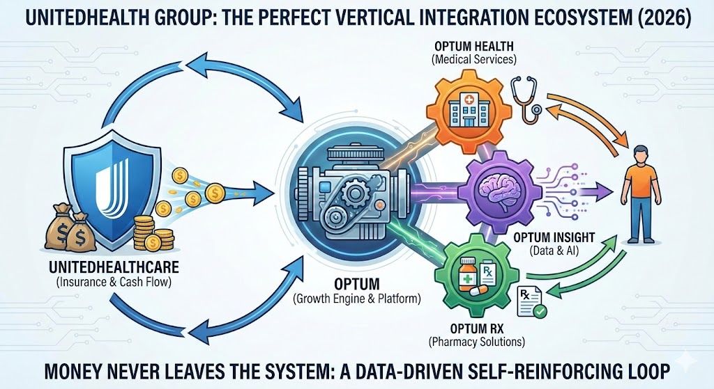 이 기업의 가장 무서운 점은 '수직 계열화(Vertical Integration)'를 완벽하게 이뤄냈다는 것입니다. 경쟁사들이 보험 상품 하나 팔기 위해 경쟁할 때, UNH는 헬스케어의 모든 단계를 장악했습니다. 이를 이해하려면 회사를 지탱하는 두 개의 거대한 축을 봐야 합니다. 첫번째 축은 든든한 현금 창출원이라고 할 수 있는 유나이티드 헬스케어(UnitedHealthcare)입니다. 이는 우리가 흔히 아는 '건강보험' 사업부입니다. 미국 내 압도적인 가입자 수를 보유하고 있으며, 여기서 매달 막대한 보험료 수입(현금 흐름)이 발생합니다. 이 돈은 단순한 수익이 아니라, 후술할 '옵텀'이라는 신성장 동력에 투자하는 자금줄이 됩니다. 두번째는 진짜 핵심 성장 엔진인 옵텀(Optum)입니다. 이것이 '핵심 키워드'입니다. 옵텀은 다시 세 가지로 나뉩니다. 첫째, 옵텀 헬스(Optum Health)입니다. 의사를 직접 고용하고 병원을 운영합니다. 환자를 진료하고 치료하는 1차 의료 기관의 역할을 수행합니다. 둘째, 옵텀 인사이트(Optum Insight)입니다. 의료 데이터를 분석하고 병원 운영 시스템을 컨설팅합니다. AI와 빅데이터가 가장 활발하게 쓰이는 곳으로, 영업이익률이 매우 높습니다. 셋째는 옵텀 Rx(Optum Rx)입니다. 약제 급여 관리(PBM)를 담당합니다. 제약사와 협상하여 약값을 정하고 유통하는, 막강한 권한을 가진 사업부입니다. 이 구조가 왜 무서울까요? 보험사(본사)가 환자의 데이터를 분석(옵텀 인사이트)해서, 가장 효율적인 치료법을 제시하는 자사 병원(옵텀 헬스)으로 보내고, 자사가 협상한 약(옵텀 Rx)을 처방받게 합니다. "돈이 회사 밖으로 나갈 틈이 없는 구조"입니다. 이 완벽한 선순환 생태계가 바로 아마존이나 구글 같은 빅테크 기업들도 헬스케어 시장에서 UNH를 넘어서지 못하는 이유입니다.
